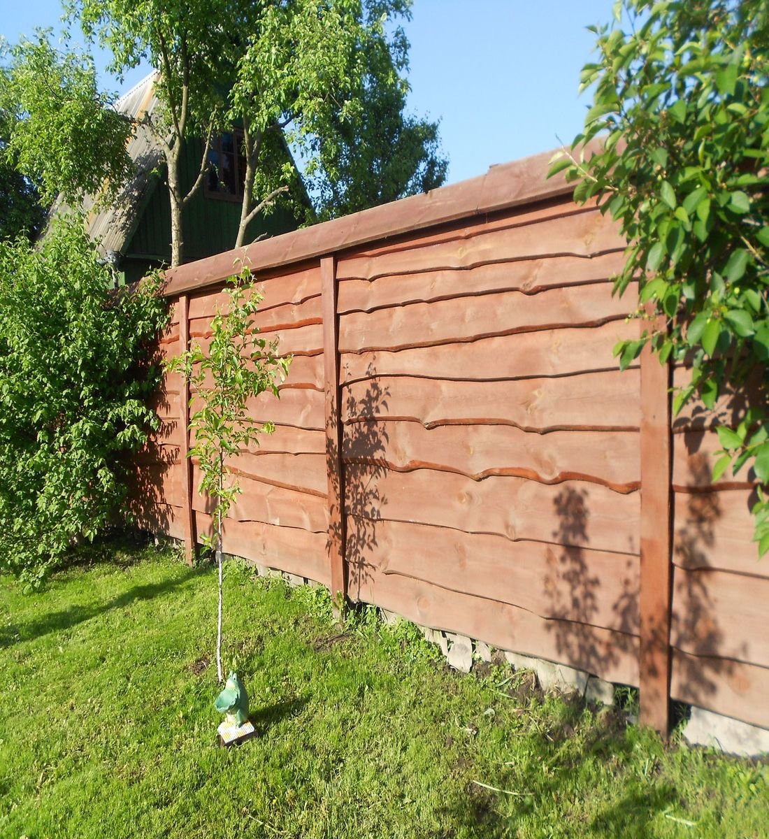 Такое название получили отшлифованные планки одинаковой ширины и высоты. Прибивают их к лагам вертикально либо горизонтально. Верхушка штакетины бывает разной (обычный спил, резьбленная). Зависит от предпочтений владельцев и их бюджета. Такой забор выходит недорого.