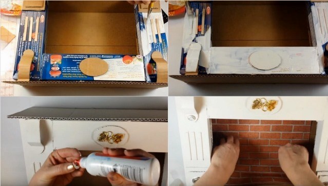- Конструкцию камина заклеивают бумагой или закрашивают. Получившиеся ниши в каркасе камина могут стать удобными полками для хранения вещей. Чтобы сделать стенки «окошек» более жесткими, используют несколько слоев картона, склеенных между собой.