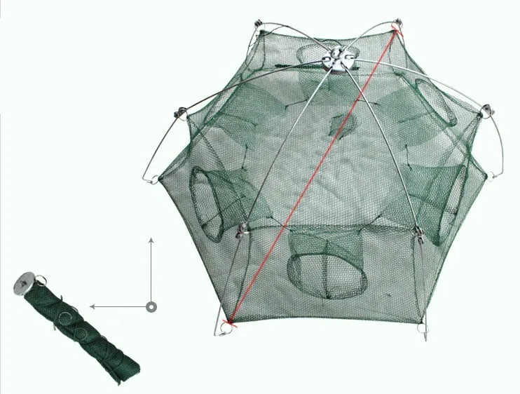 Сама сеть крепится на металлических кольцах и фиксируется на дугах. Когда конструкция расправляется, она становится квадратной либо шестиугольной. Рыбаки отмечают, что такие верши имеют высокую уловистость, однако без наживки они работать не будут. Входов может быть от 4 до 6. В ловушку отлично идет мелкая рыба и раки.