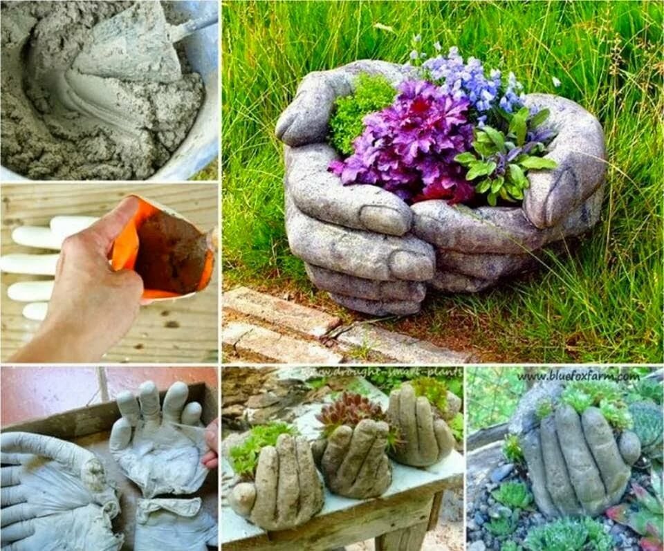 Смастерите необычное цементное кашпо. Разведите цемент, старый материал смочите в растворе. Тканью накройте ведро и дайте ему высохнуть на солнце. Высохшее изделие покрасьте.Кашпо с оригинальным дизайном – креативная вещица, которая украсит участок.