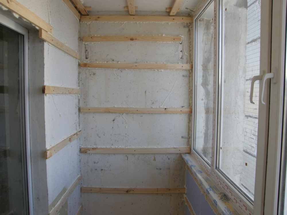 1. На внутренние стены лоджии посредством дюбелей набивается деревянная обрешетка. Для этого используют брус толщиной 20 мм и шириной 50 мм. Перфоратором бурятся отверстия в стене через брус, а затем в них забиваются дюбели. Вначале набиваются верхняя и нижняя горизонтальные планки. От них выводятся вертикальные бруски по углам, которые должны проверяться при помощи строительного уровня. Затем набиваются горизонтальные планки с шагом около 40-50 см. Достаточно четырех горизонтальных перемычек на каждую стену. Обрешетка должна быть выдержана в одной плоскости. При необходимости производят корректировку планок.