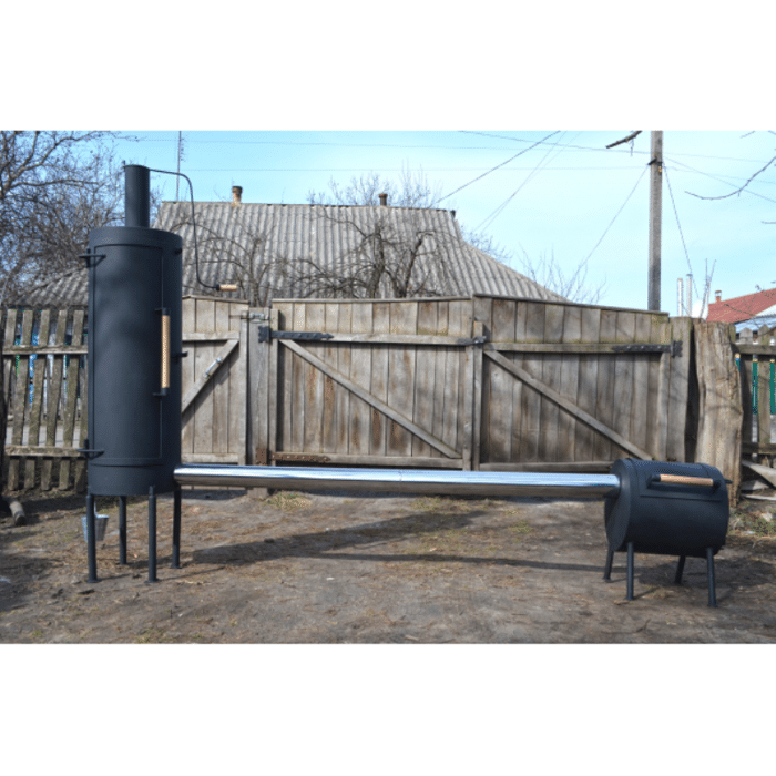 Как вы видите, схема довольно проста! Принцип действия заключается в том, что горячий дым, проходя по длинной трубе, остывает до нужной температуры, конденсируется, а значит, из него все вредные компоненты выпадают в осадок. Дальше уже в коптильную камеру поступает очищенный и пригодный к употреблению дым. Весь конденсат и твердые частицы дыма осядут и уйдут в землю, так и не причинив вреда нашим вялящимся продуктам. А для того чтобы конденсат не повредил коптильную камеру, её стоит надежно установить на кирпичи или же на деревянные чурбаны достаточной толщины.